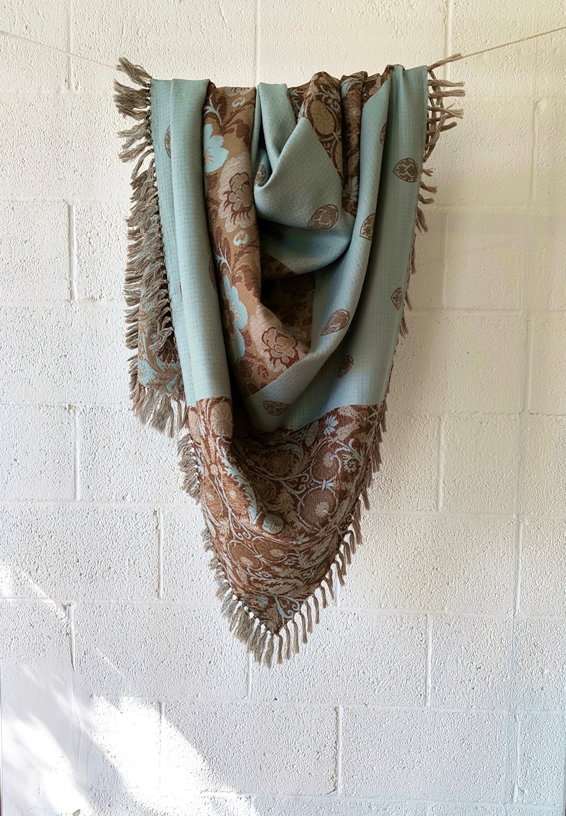 This reversible throw’s soft aqua and warm terracotta tones make it perfect for adding a refined, artisan touch to neutral or earth-tone interiors—think boho, rustic, Southwestern, or globally inspired spaces. Drape it loosely over a reading chair, the foot of a bed, or a textured sofa to introduce gentle color contrast alongside décor in cream, taupe, sage, or warm woods.